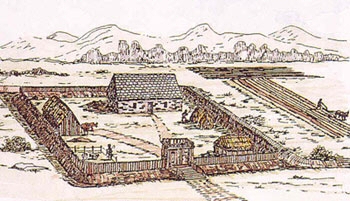 Artist's impression of a medieval moated site (after Billy Colfer).