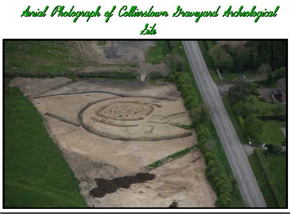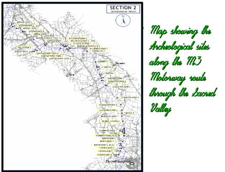 Across the Boyne is Ardsallagh, where some cremation pits were found. There was a very interesting burial, comprising 27 bodies in a semi circle, with their feet pointing inwards. The open end of the circle pointed towards the Hill of Tara. There was also a cremation urn from the Bronze age found. Also a large stone was found placed at the feet of one of these bodies. It was claimed that the burial was early Christian although if this were the case the bodies would be in an East-West orientation. This is very interesting in that the artifacts seem to suggest the burial was early Christian, but the bodies were buried in a Pagan way, suggesting that these burials were neither Christian nor Pagan and therefore dating from a very brief period in history when the two religions were intermingling. However in the center of the burial was an urn which comes from much much older tradition. The evidence seems to contradict itself (or else point towards something previously unknown). Throughout Ardsallagh there was also traces of flint scattered in the area.