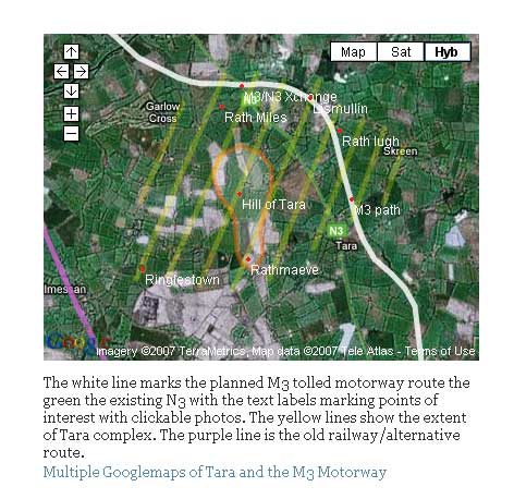 there are two protest camps at Tara - ~~~ the Vigil camp on the Hill of Tara - with the perpetual flame in the tepee - can found by turning right at the gate onto the hill and following the road around for about a hundred yards until you see tents on the left and a gap in the hedge