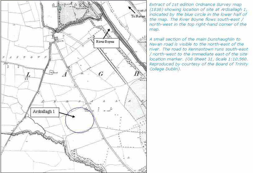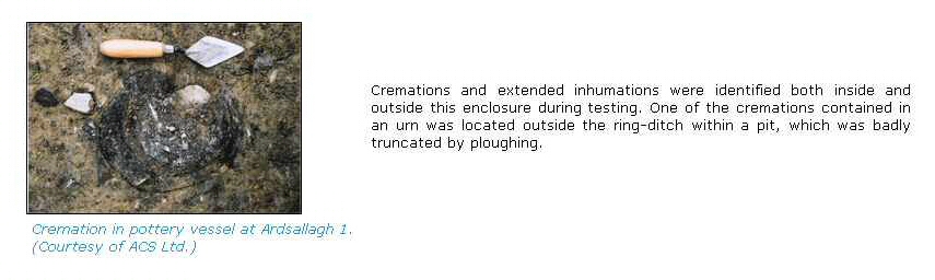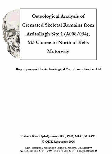 This report contains the results of the osteological analysis of cremated bone recovered at Ardsallagh, Co. Meath. Excavations were undertaken by Archaeological Consultancy Services (ACS) Ltd. as part of the M3 Clonee to North of Kells motorway development. One small deposit of cremated bone was recovered from the site of Ardsallagh 1 (A008/035), which appeared to have been disturbed by postdepositional activity.