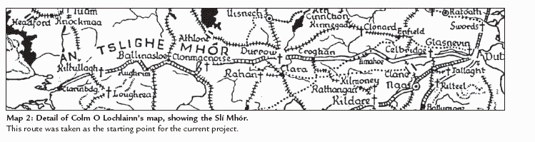 Apart from being the natural base of the Slí Mhór, it is said to have served as a political boundary during certain times of the First Millennium AD. No documentary account of its exact course is known, so it was considered futile to try and trace it in detail. On the other hand, the Slí Mhór as a major routeway would by its nature have to have been continuous. Despite numerous subsequent changes, its route would have left traces in the landscape; many recognisable on accurate modern maps and/or in the field. The route as described by Colm O Lochlainn was taken as a starting point and interpolations between O Lochlainn’s landmarks were made, based primarily on cartographic and topographical evidence. On several occasions the author disagrees with O Lochlainn’s conclusions. There was little or no work done by the present researchers to allow speculation regarding the accuracy or otherwise of O Lochlainn’s routes for the other four Slíte.