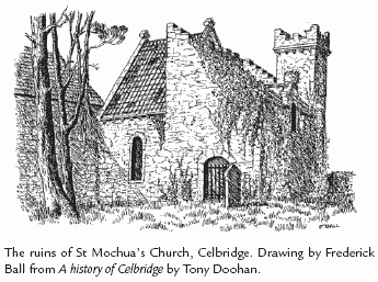 Unfortunately, there are certain problems with this line of argument. St Mochua – whose name originally was Cronan Mac Lugdach, later changed to Mo-chua* – is said to have been Abbot and probably also Bishop of Clondalkin, which does not harmonise well with the image of a hermit on the run.18 Celbridge has definite links with the saint.19 An old graveyard still contains St Mochua’s Church, and there is also an old inscribed stone slab in existence that formerly marked St Mochua’s holy well. |