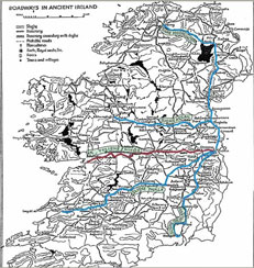 Colm O Lochlainn in his 1940 essay, Roadways in Ancient Ireland, has mapped these roads, along with many minor ones, and his map shows a clear convergence of four of these highways on Dublin.13 He suggests that perhaps a powerful king like the legendary Cormac Mac Airt built access roads from Tara to pre-existing routes that might have been in use for centuries before his time. I will briefly deal with the Tara connection in the Appendix VIII, but for the present project I have chosen to explore in some detail the route from Dublin to Clarinbridge, following O Lochlainn’s outline.* While O Lochlainn’s work is based largely on documentary sources, our research builds on it and makes ample use of maps, both old and modern, and takes a close look at the topography along the route.