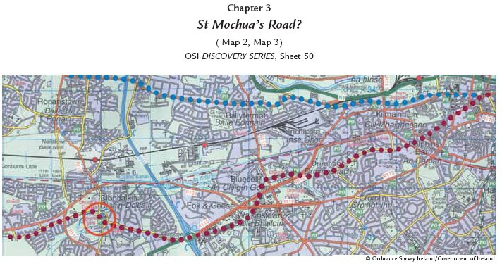 Chapter 3 St Mochua’s Road? OSI DISCOVERY SERIES, Sheet 50 Map 3: Dublin (Cornmarket) to Clondalkin. Traditionally, the course of the Slí Mhór is said to have started in Dublin’s High Street, near Christchurch Cathedral. Extant street/road patterns suggest that it continued via Cornmarket, Marrowbone Lane (the curved, northern part), Mourne Road, Drimnagh, Old Naas Road, Robin Hood Road, Red Cow Roundabout, Monastery Road into Clondalkin and out by the old Nangor Road. The red circle marks Clondalkin’s old monastic centre. © Ordnance Survey Ireland/Government of Ireland |